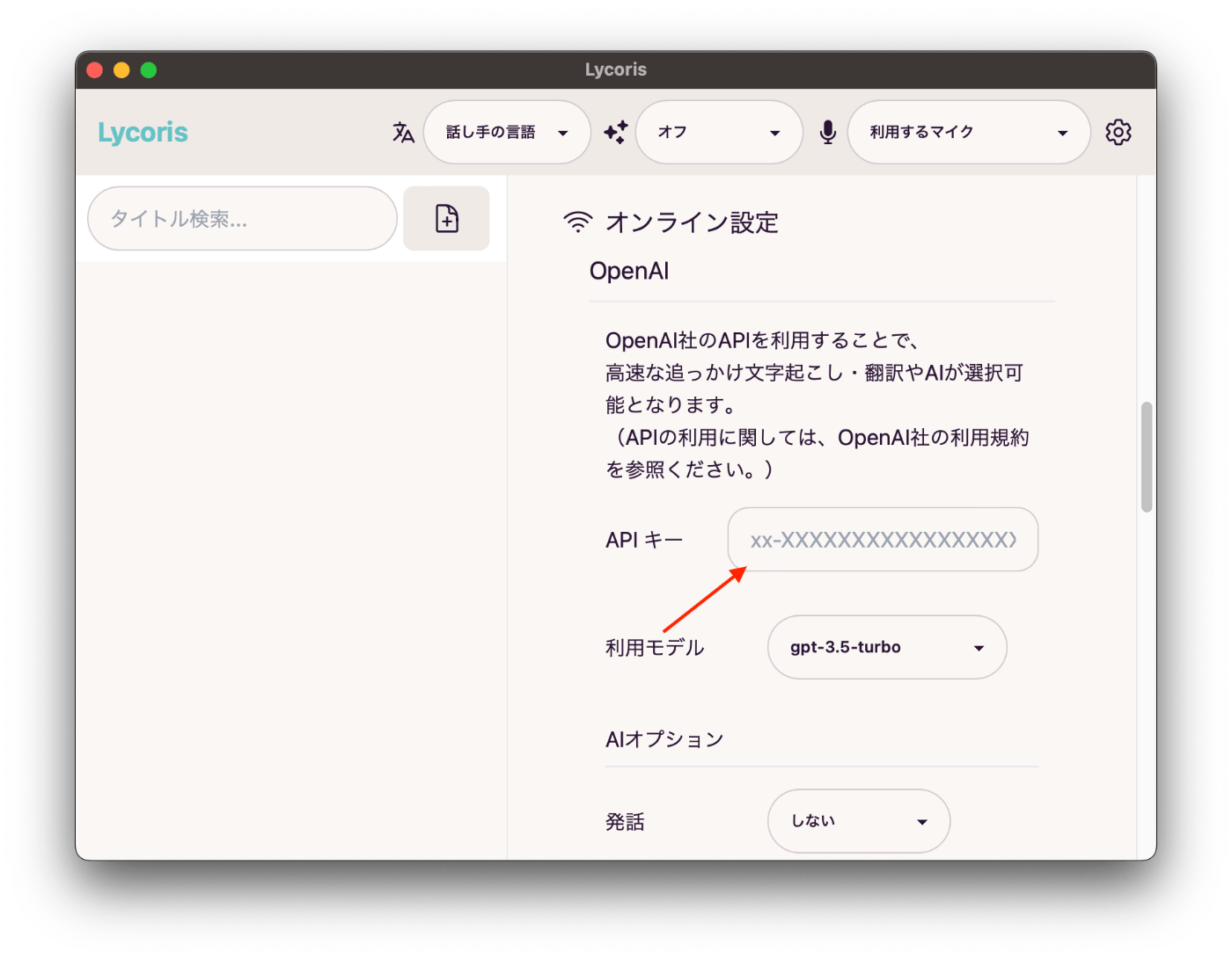オンラインで追っかけ認識/翻訳する場合は、同じく設定内で、OpenAI社のAPIキーを入力します。
