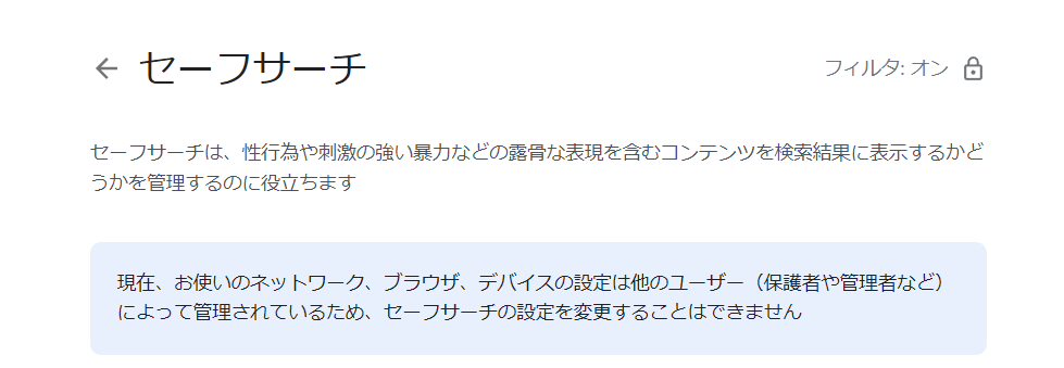 このようにセーフサーチボタンに鍵がかかり,OFFにさせないようにすることができます.シークレットモードでは機能しません.