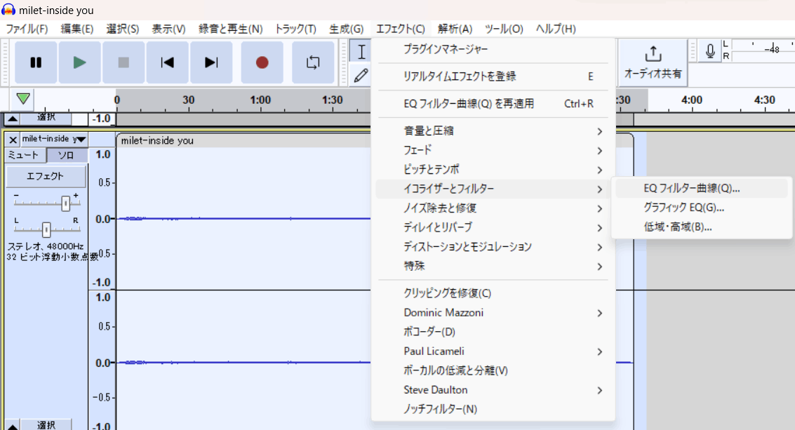 上のウインドウで「エフェクト > イコライザーとフィルタ > EQフィルタ曲線」と進む