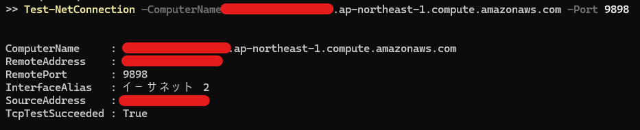Test-NetConnection -ComputerName [IPまたはホスト名など] -Port 9898