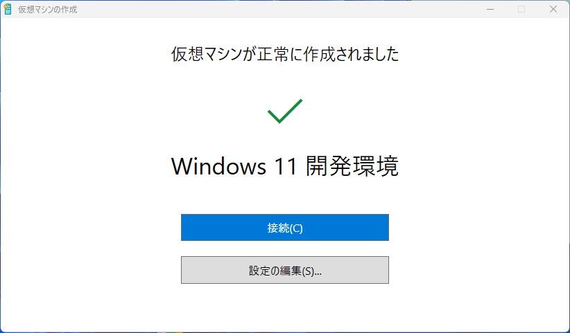 終わると仮想マシンが正常に作成された旨のウィンドウが出てきます。