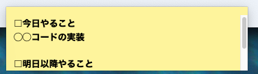 たとえば、付箋のようなアプリ(Macならスティッキーズが標準で入っています)で、今やっていることを常に表示しておくのがオススメです。スティッキーズなら、「ウインドウ」>「常に手前に表示」と選択することで、常に表示することが可能です。同時に、シングルタスクにしたい場合、基本的には降ってきたタスクを保存して寝かしておく必要があります。こちらも付箋アプリなどで下記のようにまとめておいたほうが良いでしょう。