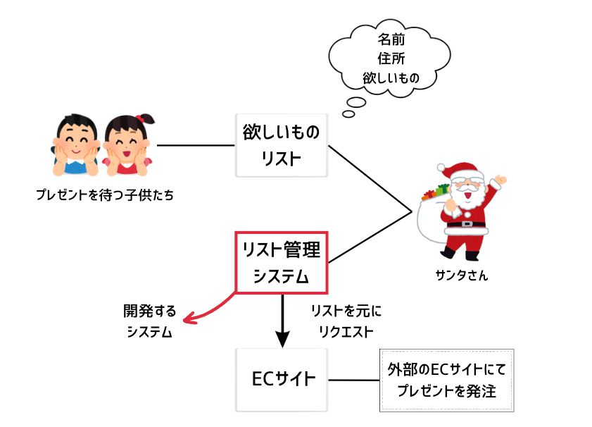 サンタさんが一人で世の中の子供たち全員分の手紙を読んで、一人一人の欲しいものやお届け先を把握するのは大変です。そこで、一人一人の名前や住所、欲しいものをリストで管理して、外部のECサイトと連携して一気に発注してしまおうというシステムを作ることになりました。そのシステムの関連図が上の図になります。