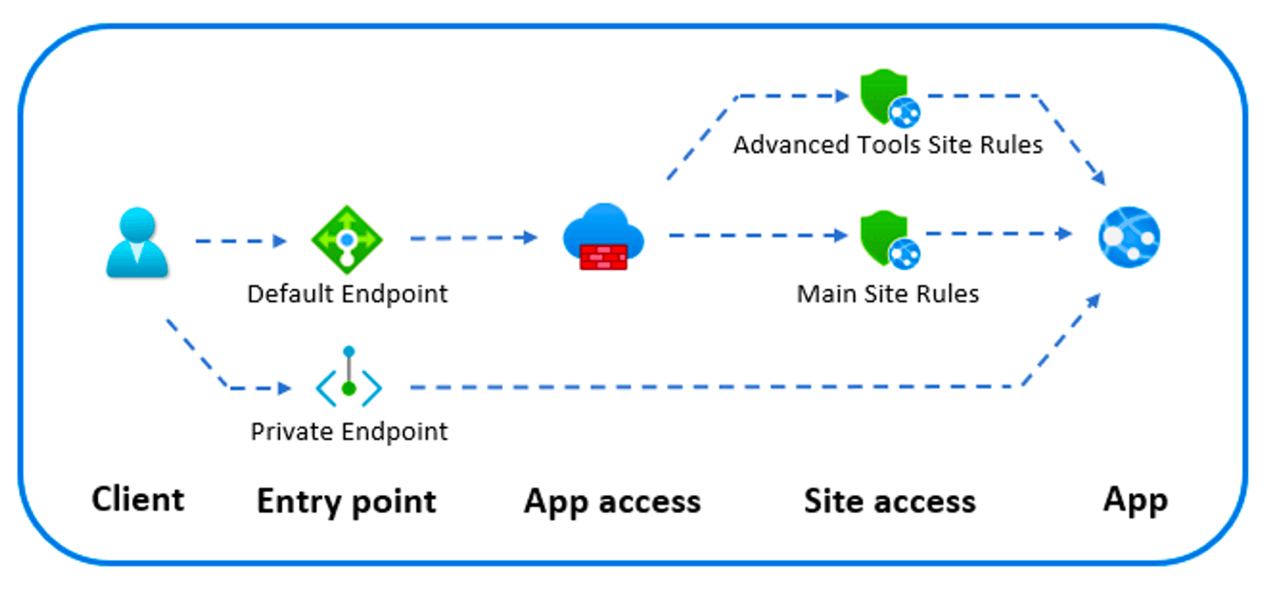 トラフィックが App Service に達すると、最初に、そのトラフィックがプライベート エンドポイントから送信されたのか、または既定のエンドポイントを経由しているのかが評価されます。
