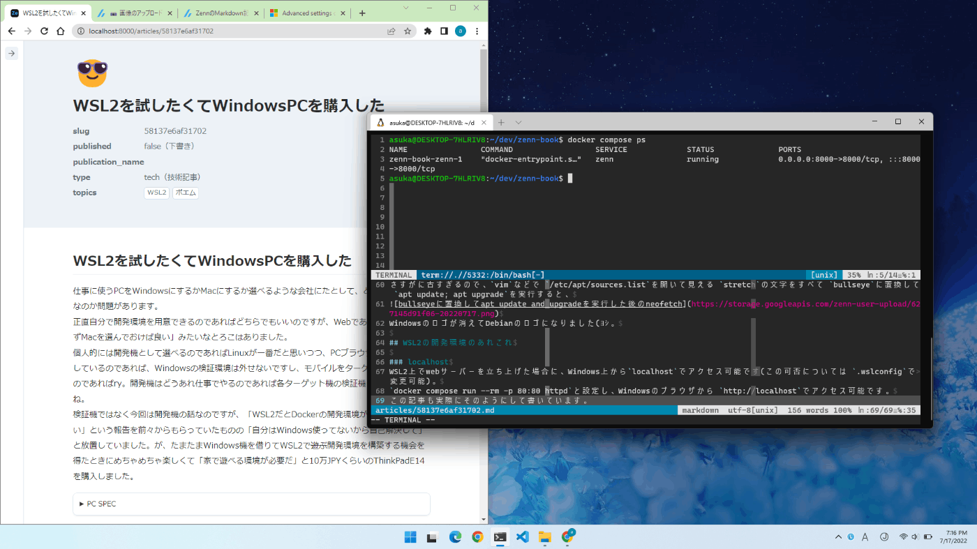検証機ではなく今回は開発機の話なのですが、「WSL2だとDockerの開発環境がうまく起動しない」という報告を前々からもらっていたものの「自分はWindows使ってないから自己解決して」と放置していました。が、たまたまWindows機を借りてWSL2で遊ぶ開発環境を構築する機会を得たときにめちゃめちゃ楽しくて「家で遊べる環境が必要だ」と10万JPYくらいのThinkPadE14を購入しました。