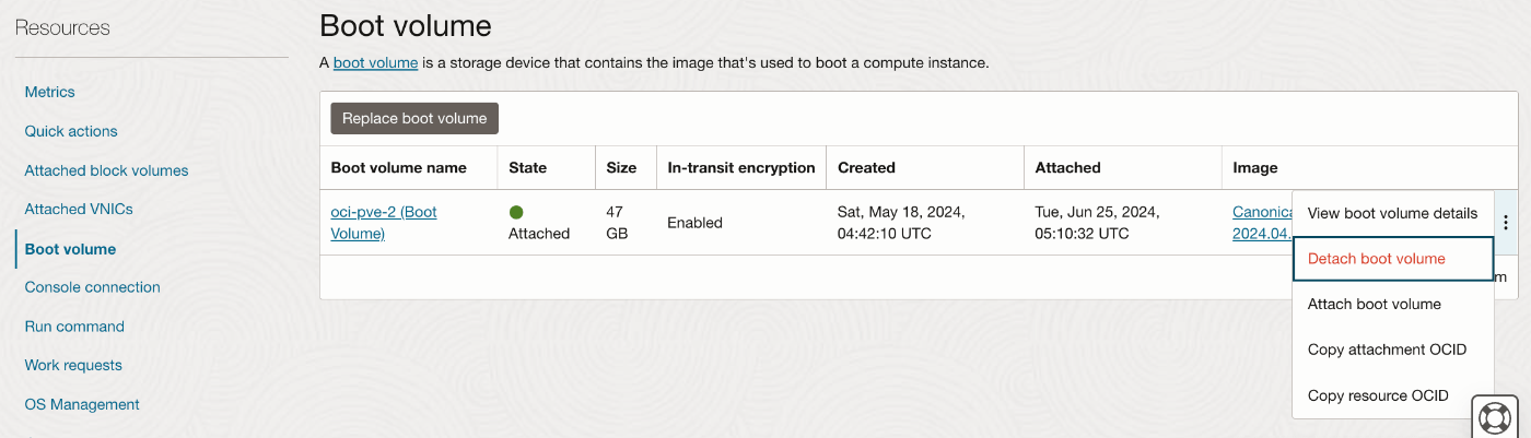 OCI Consoleの「Boot Volume」のとこからDetach Volumeすると、他のインスタンスにBlock Volumeとして割りあてられるようになるので、別のインスタンスから操作する。