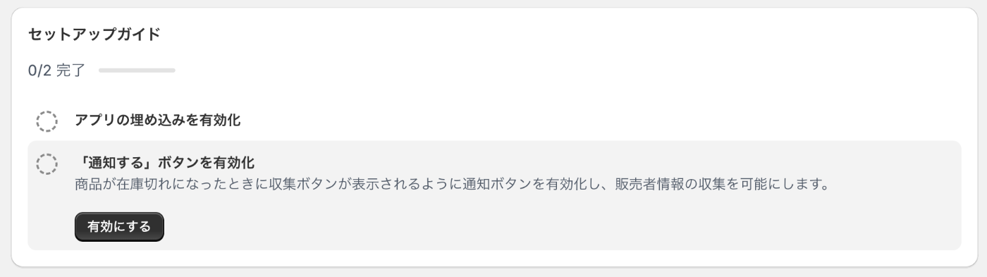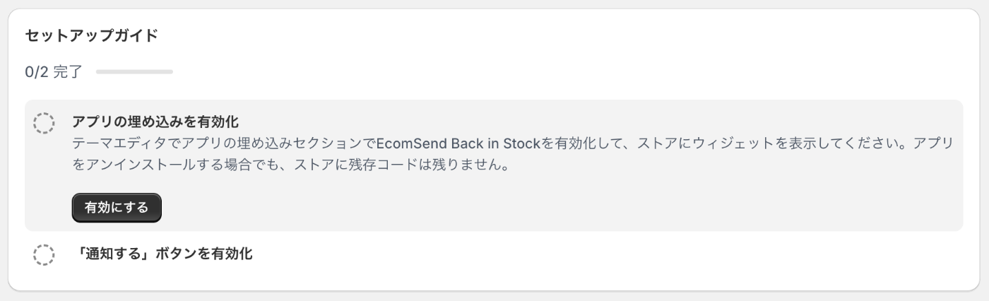 「ES Back in Stock」のホームに戻り、「セットアップガイド」からアプリを有効化します。