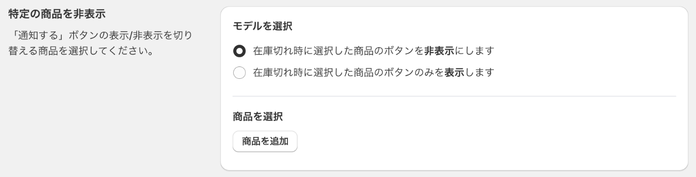 「在庫切れ時に選択した商品のボタンのみを表示します」を選択すると...