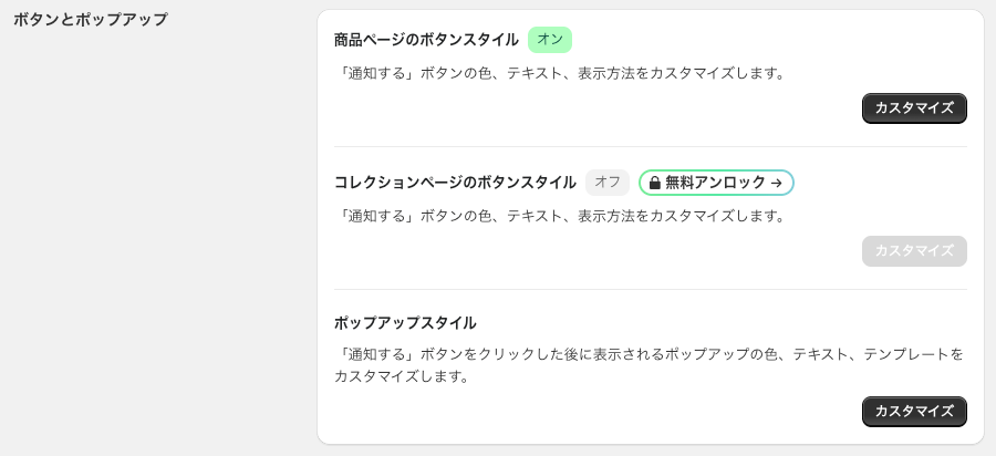 | Back in Stock-PreOrder | 無料 | メール・SMS | ○ ※1 | ワンクリックで設置でき、メールのカスタマイズなども可能。 |