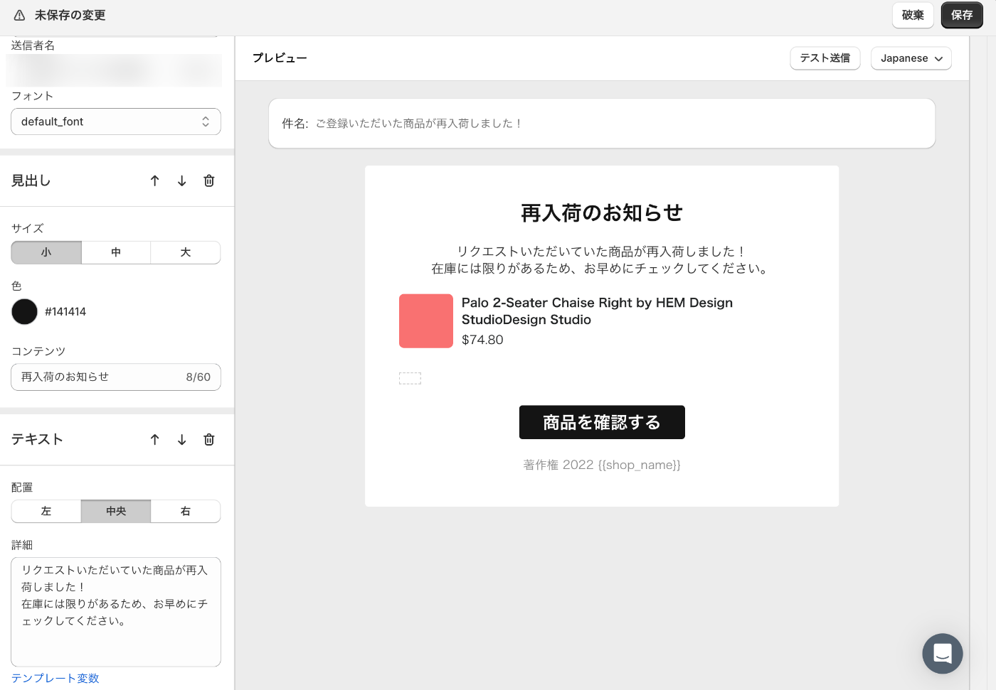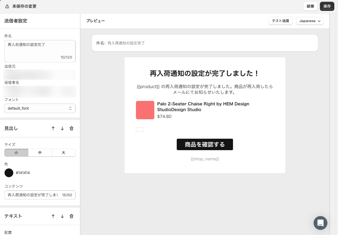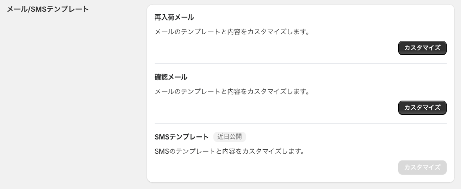 「再入荷通知メール」と「確認メール」はユーザーが受け取るメールなので、テキストやデザインの調整は入れた方が良いかと思います。