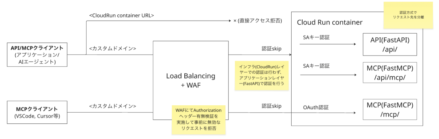 上記の調査の内容を踏まえて、FastAPI上にマウントすることで認証方式別のFastMCPの2つのインスタンスを1つのFastAPIアプリケーション上で動かすという設計を採用しました。