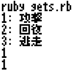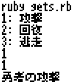 「うん。 画面に攻撃、回復、逃走って出すのは、puts "1: 攻撃" って書けばいいんだよね。」
