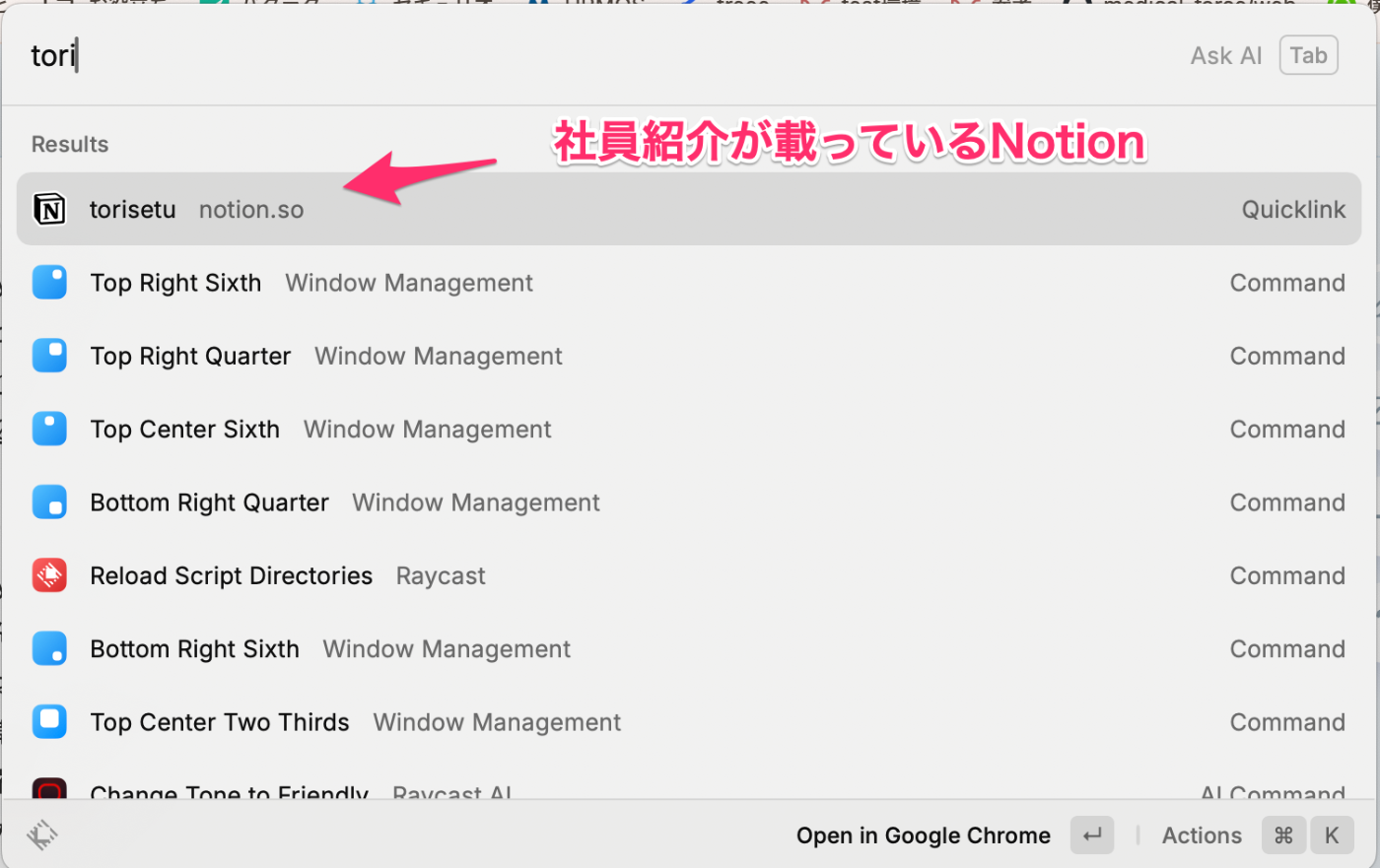 - Raycast起動後、先ほど登録した名前を入力し、クリックしたら登録したURLが開きます