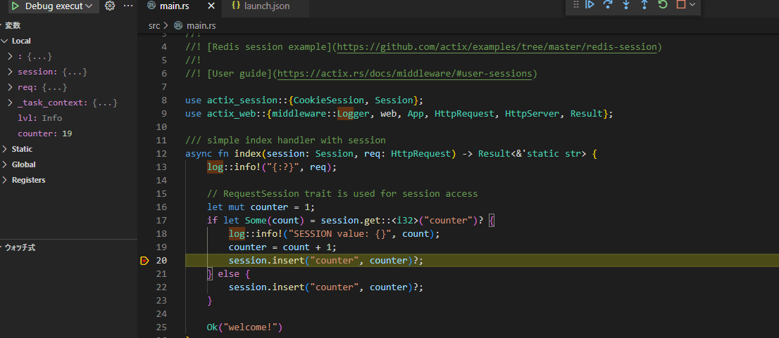 「main.rs」ではルートに対して関数「index」を実行する使用でセッションカウンターが実装されてました。