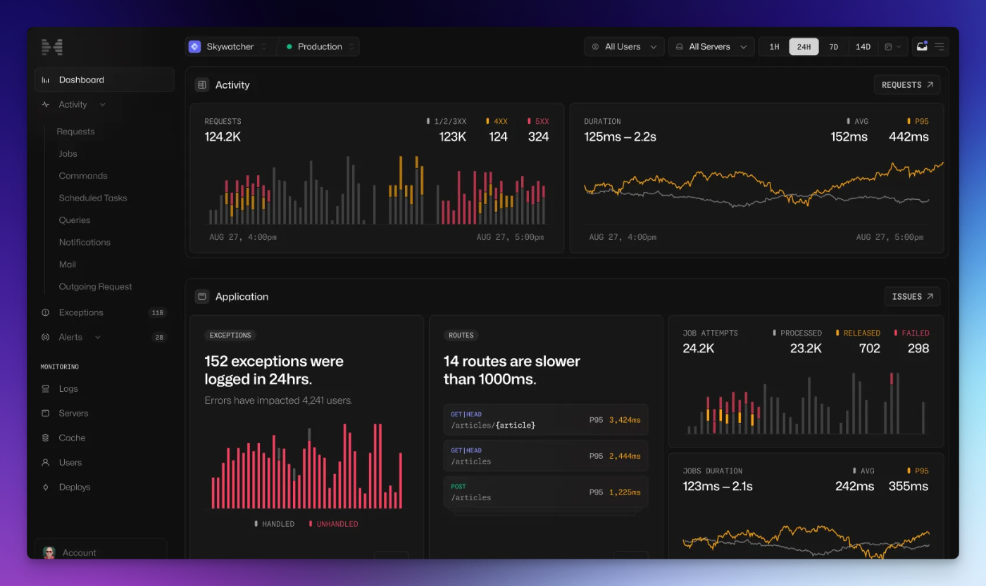 Laravel Nightwatch は、Laravelアプリケーションのための公式Observabilityツールです。アプリケーションのパフォーマンス監視(APM)、エラートラッキング、ログ管理などを統合的に提供します。Laravelの内部構造を熟知したチームが開発しているため、Laravel独自のメトリクスも提供します。