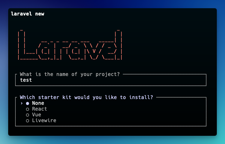 laravel new コマンドでプロジェクトを作成する際、スターターキットを選択するだけで、これらすべてが自動で設定されます。