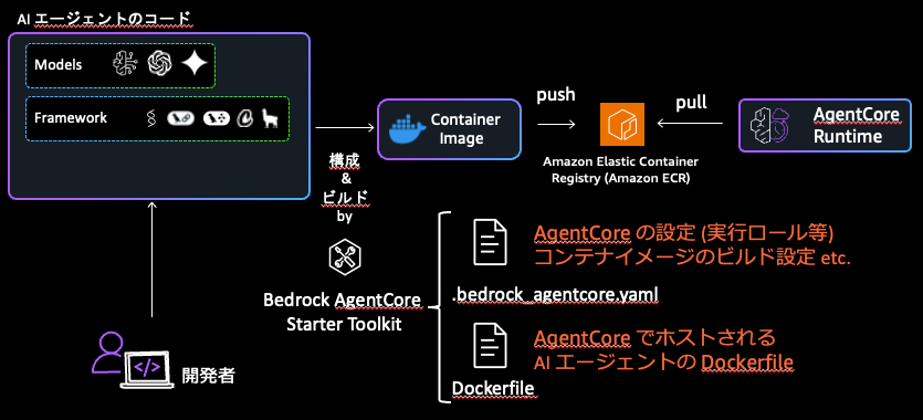 つい先日直接コードを AgentCore Runtime にデプロイできるアップデートがありましたが、2025/11/7 時点では AgentCore Starter ToolKit で作成される AgentCore Runtime は、ECR からコンテナイメージを pull する形で起動されます。