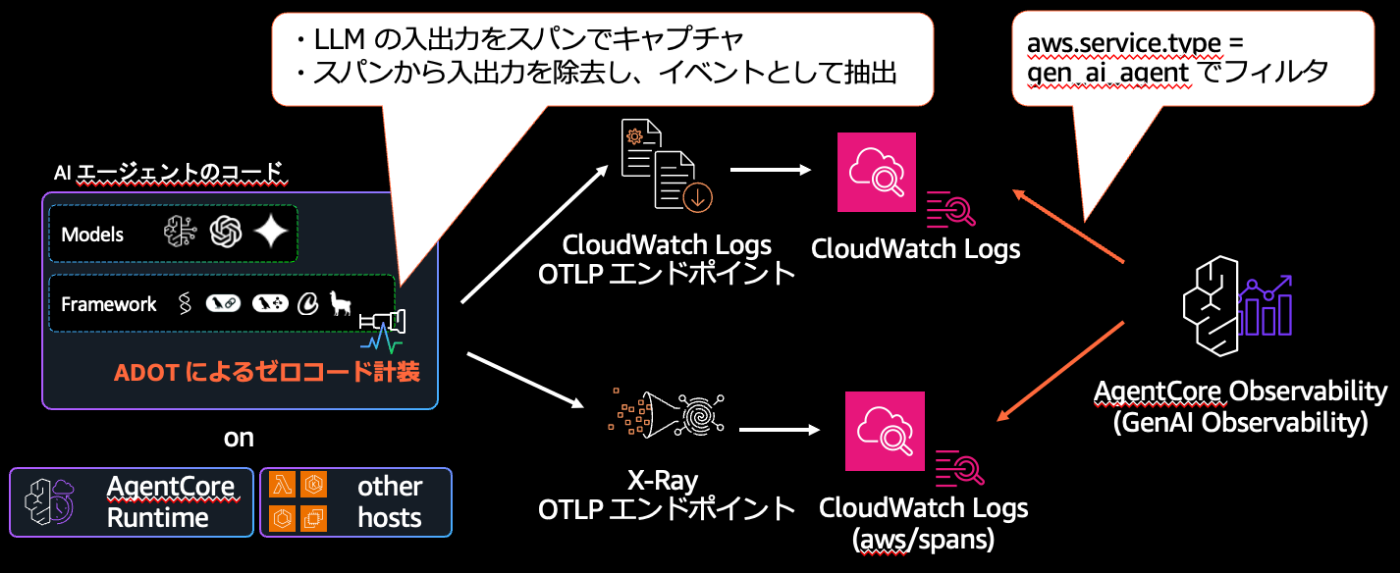 - AgentCore Runtime 上で AI エージェントをホスティングしたり、その他のホスティング環境でも AI エージェント用の ADOT に関する環境変数設定をすることで、AI エージェントのテレメトリに特化した設定になること