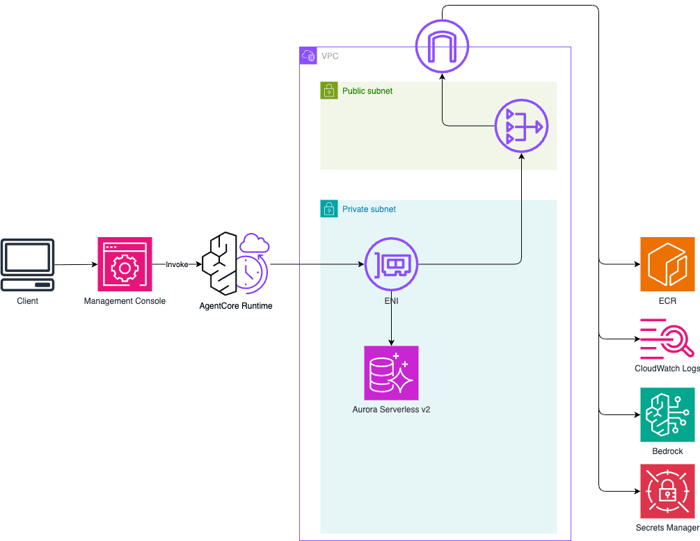 今回は AgentCore Runtime の VPC 対応サンプルとして以下を構築します。VPC 対応を行う場合は AgentCore Runtime が使用する ENI が VPC 内で作成され、そこ経由でアクセスが行われます。
