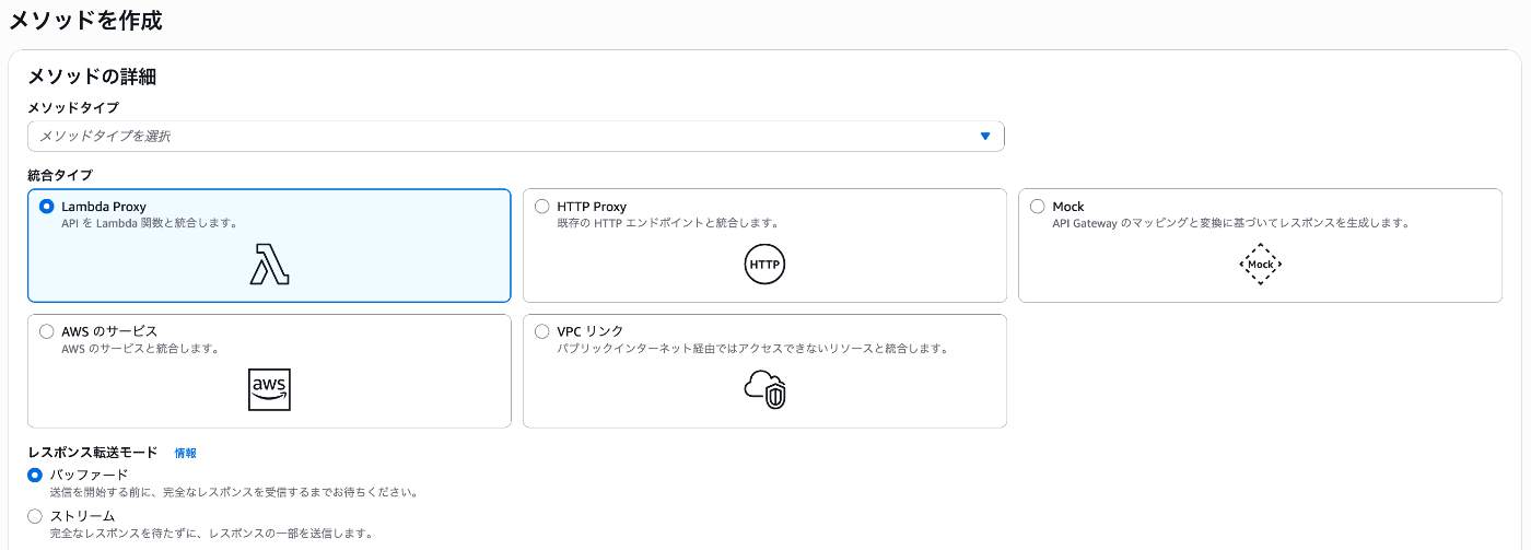 レスポンスペイロードストリーミングは、HTTP_PROXYまたはAWS_PROXY統合タイプにのみ使用できます。これには、Lambdaプロキシ統合とHTTP_PROXY統合を使用するプライベート統合が含まれます。