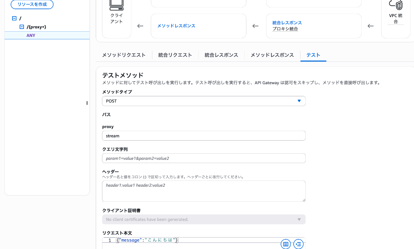 Streaming Responseの場合であっても、API Gatewayのマネジメントコンソールから動作確認ができます。