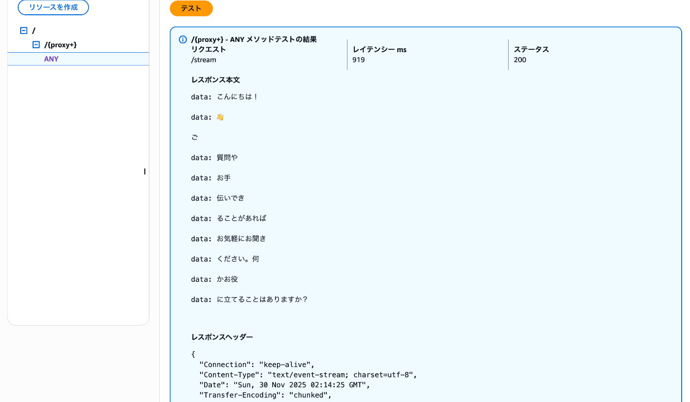 - ストリーミング対応: API Gatewayのresponse streaming機能を有効化