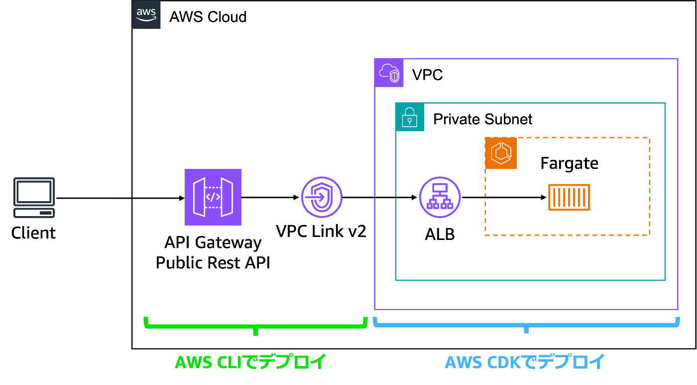 Private ALB→ECS部分はCDKで、API Gateway部分はAWS CLIでデプロイしていきます。