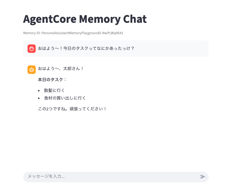 以下のような形で、Memory ID が出力されれば OK です。これで AgentCore Memory リソースが作成され、記憶が保持できるようになりました。