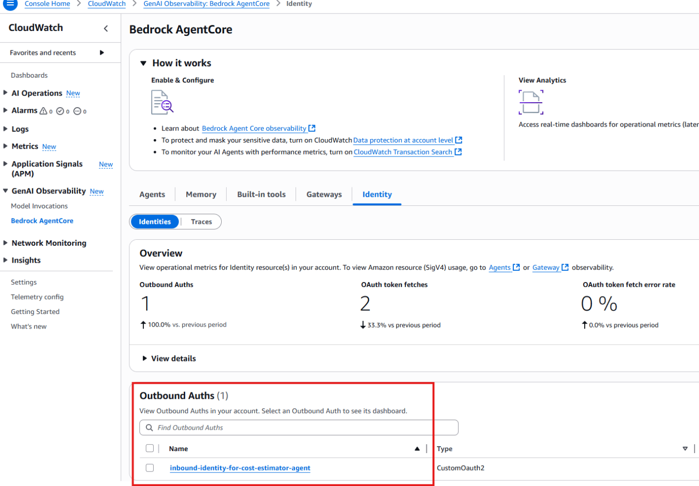 表示されるのに少し時間がかかりますが、AgentCore Identity が表示されます。AgentCore Identity から見ると Outbound である点に注意してください (User -> AgentCore Identity -(Outbound)-> 認証 -(Inbound)->AgentCore Runtime) という流れになってます。