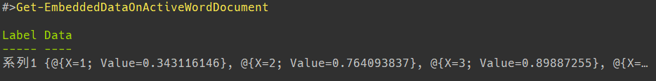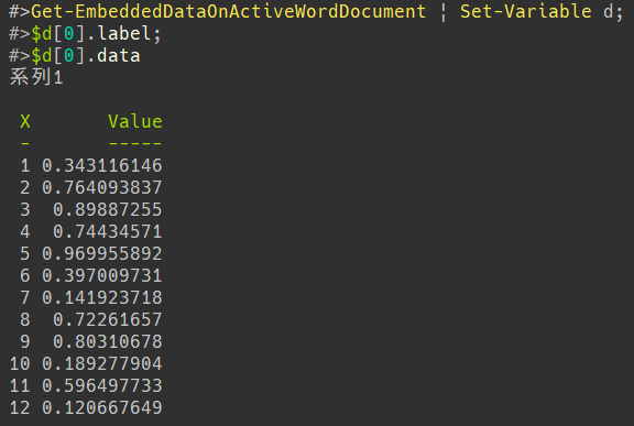 Word を開き、調べたいグラフをクリックして選択した状態でコマンドレットを実行すると、コンソール上にグラフ内のデータ系列の値をオブジェクトとして取得できるようになります。