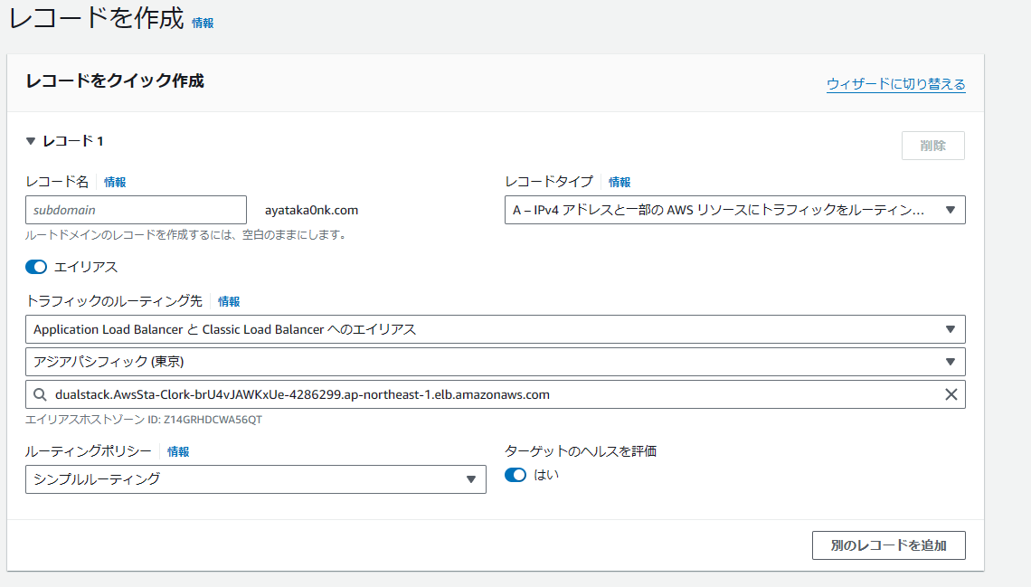 以上を踏まえて、ayataka0nk.comドメインに対してサブドメインclockworkを切って向き先をALBにするならこんな感じですかね。勘。