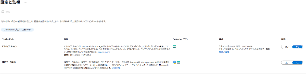 ・ストレージの「設定」というセクションからDefenderプランが正しく動作するために必要な構成状況を確認・設定を変更することができます。