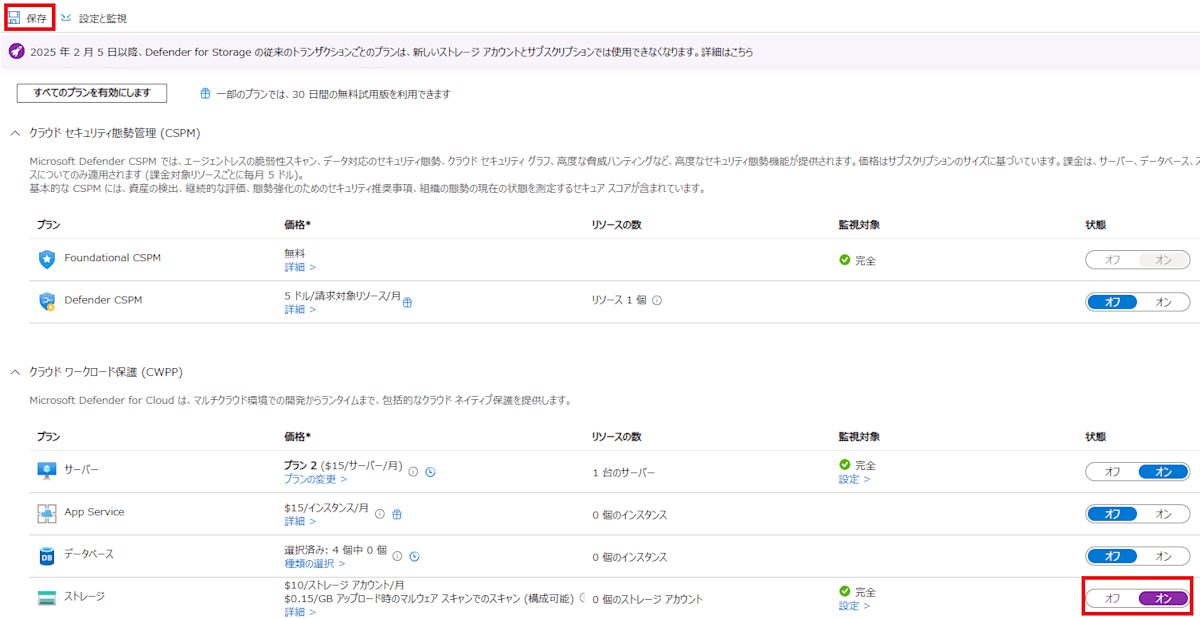 ・「Defender プラン」画面で「ストレージ」をオンに切り替え保存します。