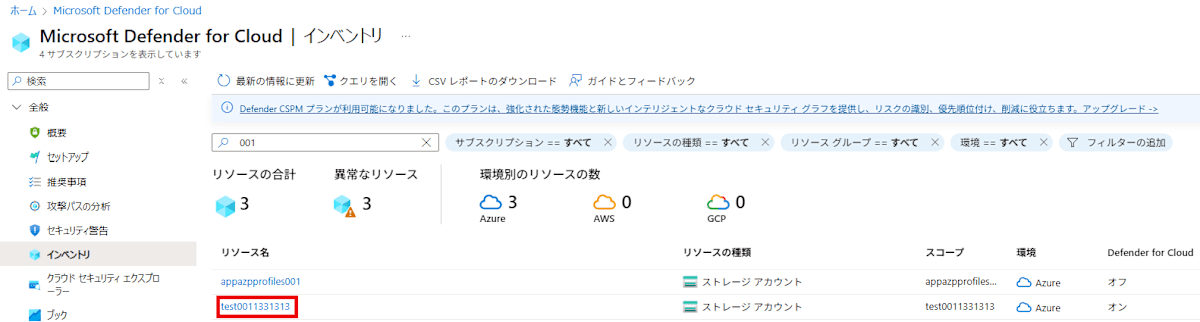 ・ストレージアカウントが、Defender for storageによって保護対象として認識されているかインベントリ画面で確認します。