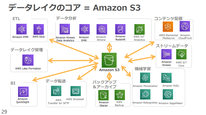 S3 にデータを保存しておくことで、分析基盤やリアルタイムデータ連携、AIソリューションの構築など、他のAWSサービスとの連携を通じて多様な要望を実現できます。