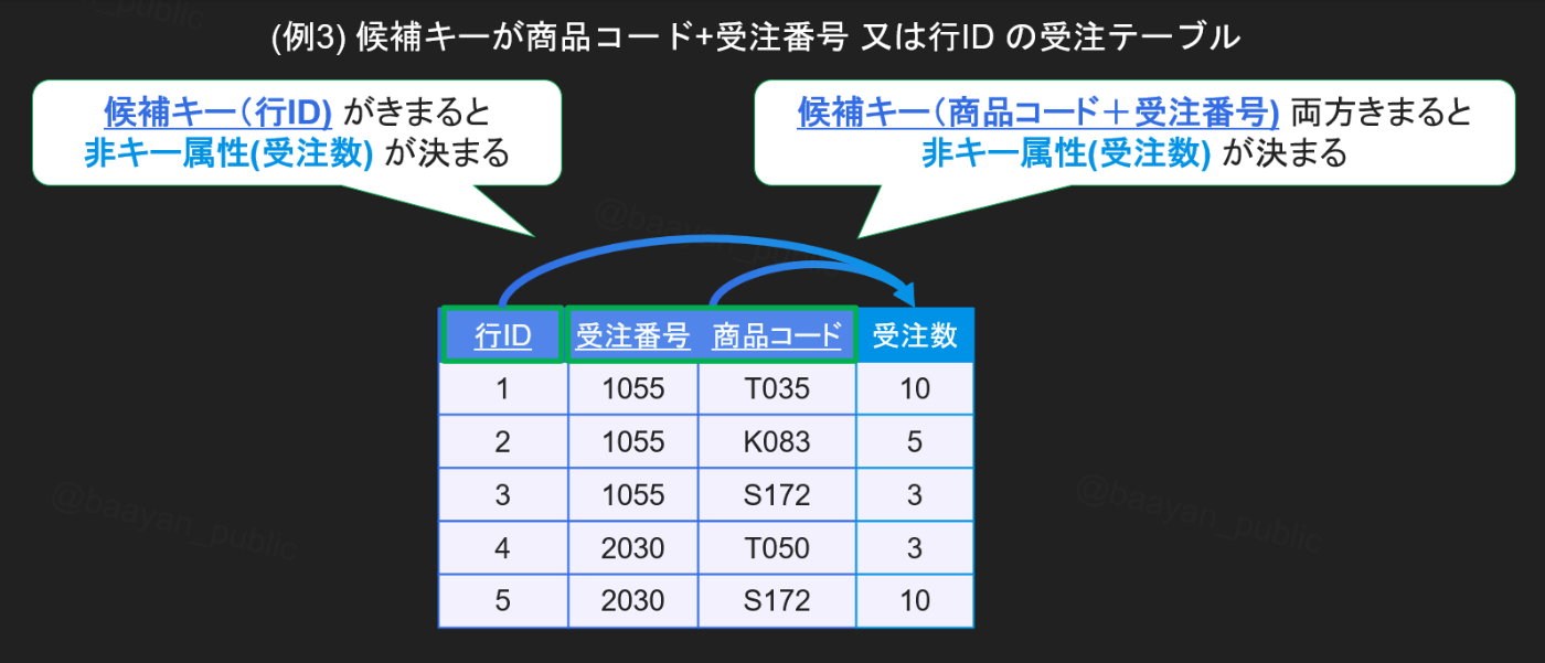 候補キー(商品コード+受注番号)の列全てが決まると非キー属性(受注数)が決まるので