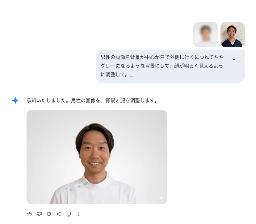 NanoBananaに、上記の画像と、加工済みのセラピストの画像をアップし、男性の画像の修正と、着ている服装の差し替えのスクリプトを書きます。