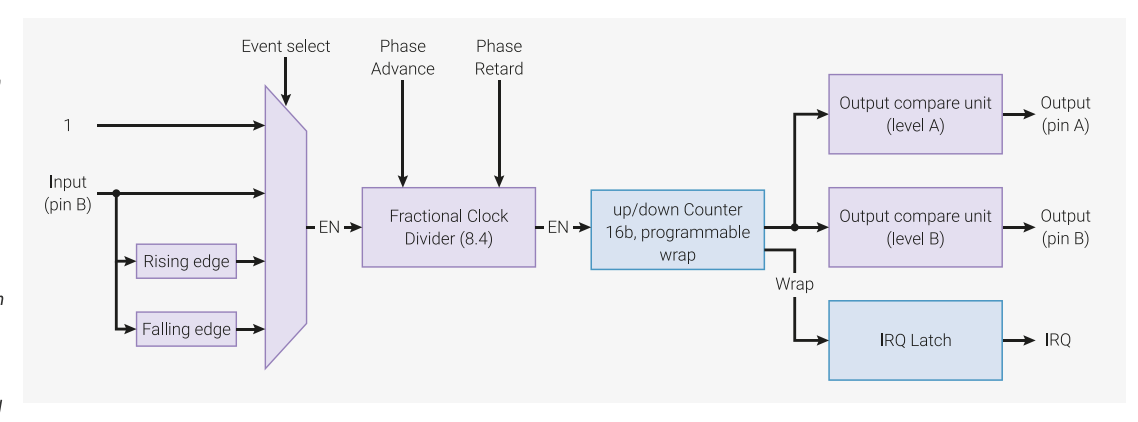 コードの話に入る前に、PWM回路の説明をいたします。以下、公式のPDF(リンク)から抜粋したPWMスライス回路の図です。RP2040は、この図の回路と同じものが計8つ備わっています。