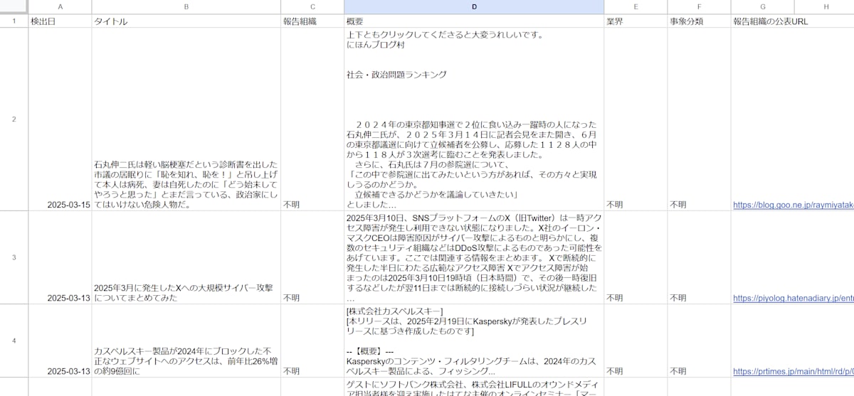 sheet.appendRow(["検出日", "タイトル", "報告組織", "概要", "業界", "事象分類", "報告組織の公表URL"]);