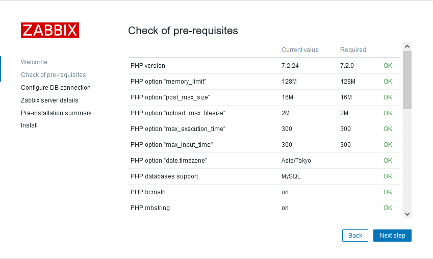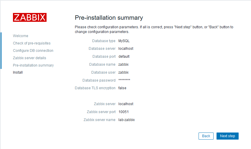 MySqLの情報を聞かれるけどほとんど入力されているのでzabbixユーザーのパスワードを入力したらNext stepをクリック