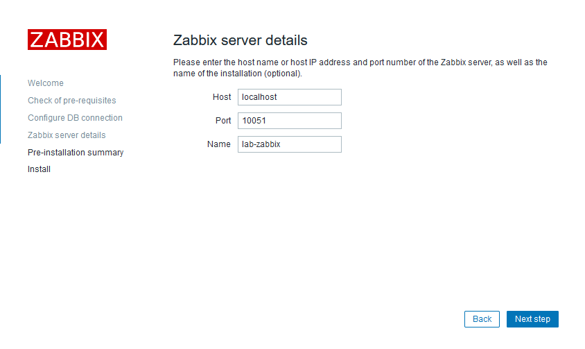 zabbixサーバのIPアドレス、もしくはホスト名と使用ポート、zabbix名を入れてNext stepをクリック