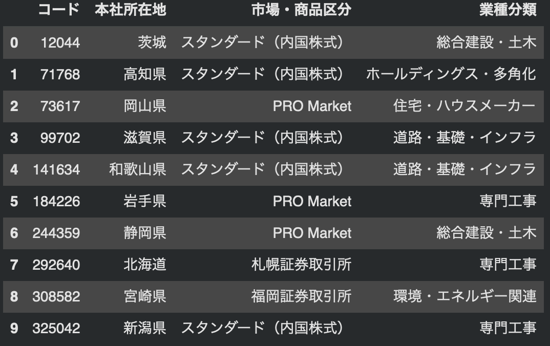 本社所在地: 10社すべてが異なる都道府県に位置しており、各地域密着型の分析フローが必要。