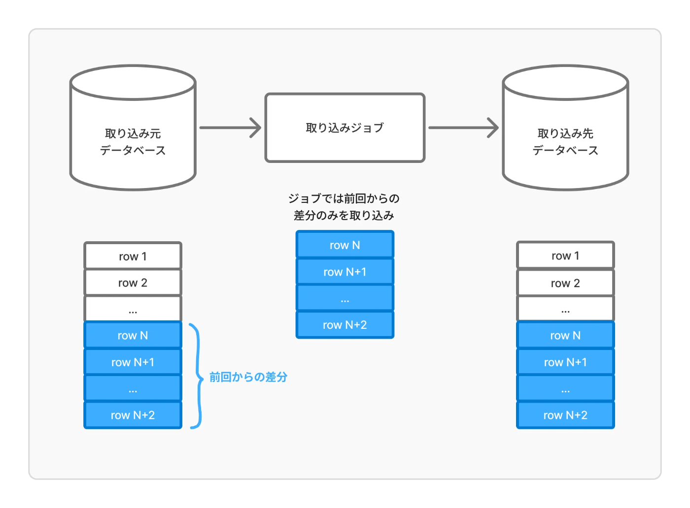 たとえば SaaS の API からデータを取り込むとき、?after=2025-01-01 のようなパラメータで直近の更新分だけ取得することがあります。これも Incremental Loader の考え方です。また、厳密にはデータ取り込みジョブではありませんが、dbt の incremental モデルも同じ考え方にもとづいています。
