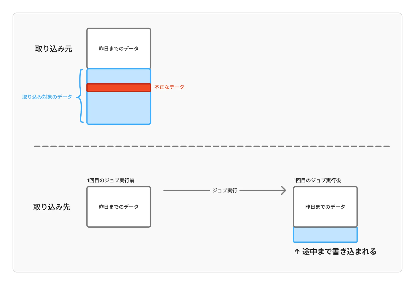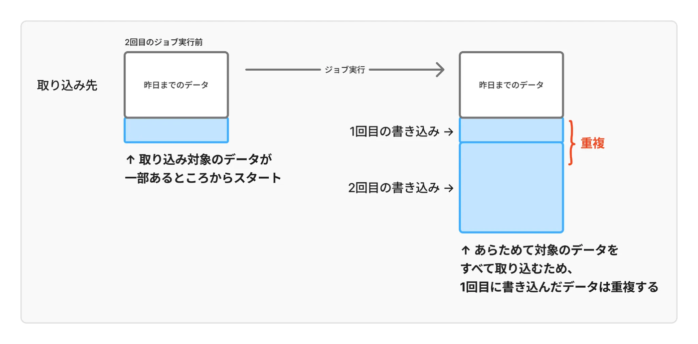 重複データをつくらずにリトライするためには、DELETE 文を発行してからジョブを再実行する必要がありますが、本番環境で DELETE を実行するのは神経を使いますし、そもそも人間に書き込み権限がないことも多いです。