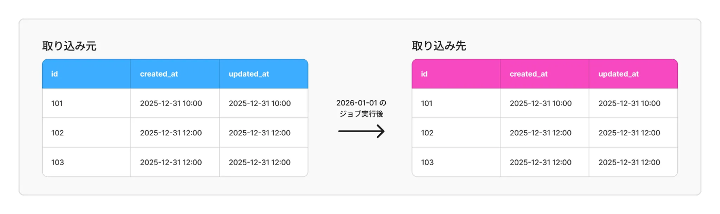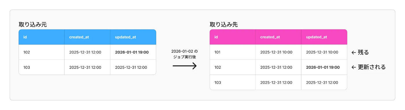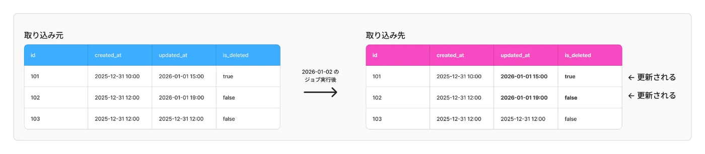 2026-01-01 のジョブでは、前日(2025-12-31)以降に更新されたデータが対象になるため、3行すべてが取り込まれます (下図右側)。ここでは、 updated_at を基準に更新対象を特定しています。