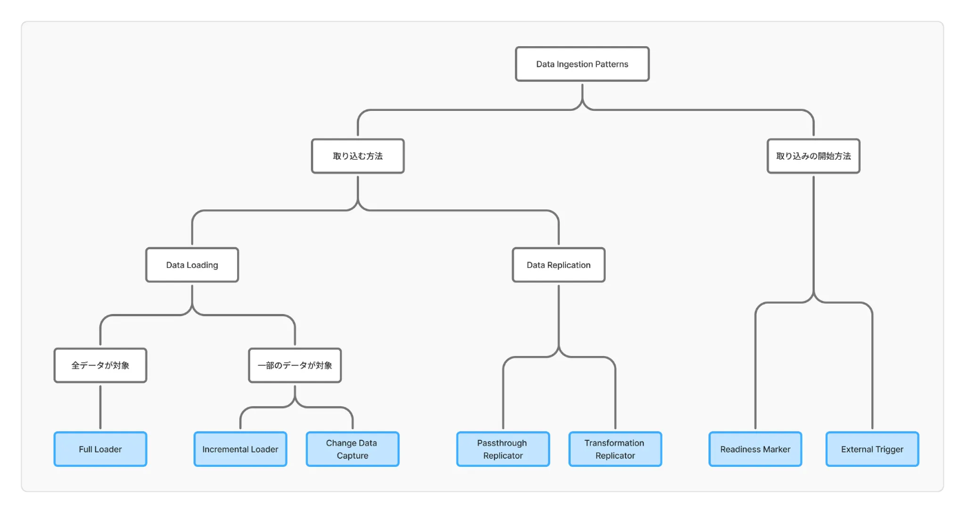今回は2章 "Data Ingestion Patterns" のうち、Data Loading に分類される 「Full Loader」「Incremental Loader」「Change Data Capture」 の 3パターンを見ていきます。参考までに、2章で取り上げられるパターンとその分類を下図に示します。