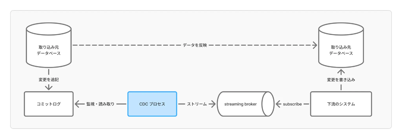- ストリーミングブローカー: 取り出した変更イベントを一時的に保持し、下流のシステムに流す中継地点
