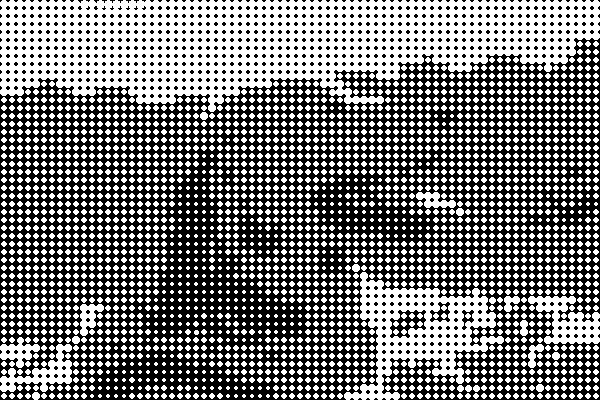 ハーフトーンは画像内の範囲ピクセル、たとえば10x10ピクセルのような範囲の明るさ平均を算出し、その値をもとに特定の形で描画し直す処理である。上記画像では明るさが大きいほど、大きい白円を描く仕組みになっている。