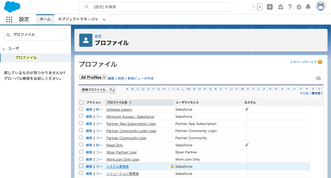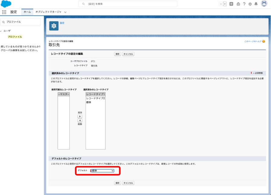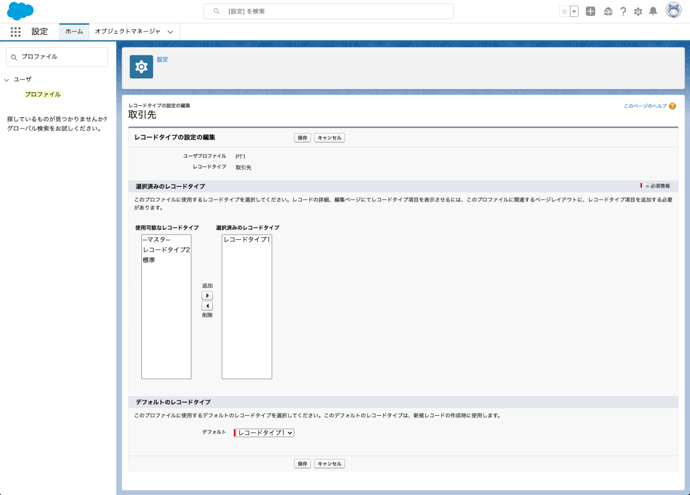 特定のレコードタイプをデフォルトにしたい場合はプロファイルから設定する。