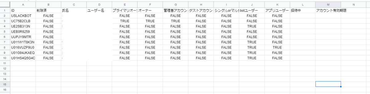 sheet.appendRow(['ID','削除済','氏名','ユーザー名','プライマリオーナー','オーナー','管理者アカウント','ゲストアカウント','シングルorマルチ','botユーザー','アプリユーザー','招待中','アカウント有効期限']);
